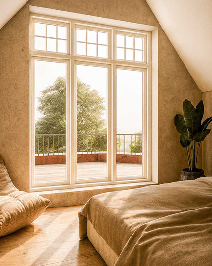De lodrette og horisontale linjer er afbalanceret, så huset står med en rolig tyngde mod landskabet. Gesimser, murdetaljer og vinduesindfatninger arbejder som diskrete lag, der giver liv til facaden uden at dominere. I vinduesrytmen ligger en gentagelse, der binder huset sammen og forankrer det i den klassiske villatradition – samtidig med at de større åbninger mod haven giver en nutidig lethed.