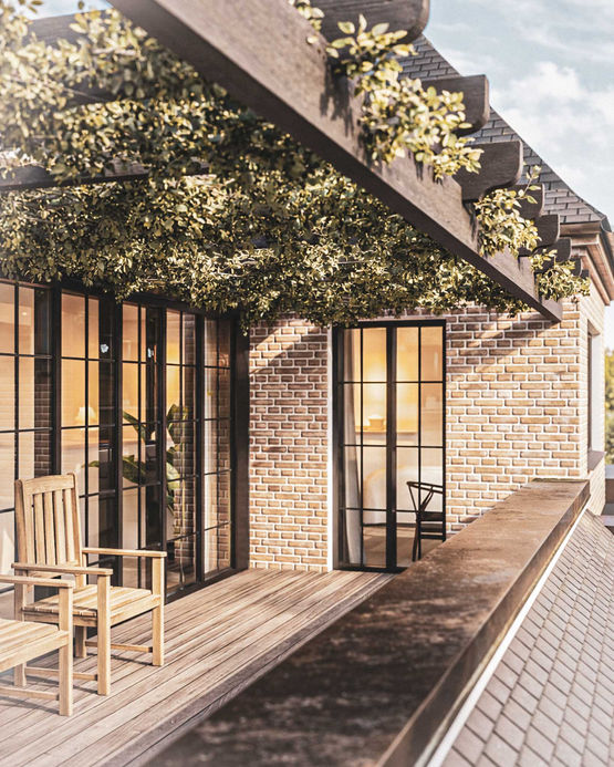De smukke røde mursten er bevaret og spiller nu op mod nogle elegante sorte vinduesrammer med sprosseopdelinger og eksklusive kobberdetaljer. Tilbygningen med udestuen tilføjer et moderne touch med sit flade tag, samtidig med at store vinduespartier nu åbner huset op mod den fantastiske udsigt til vandet.