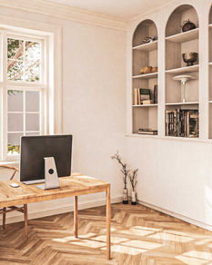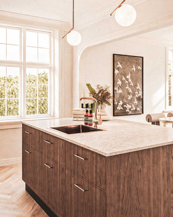 Materialerne understøtter helheden: stuk giver loftet tyngde, sildebensparket samler rummene i en rolig rytme, og køkkenets træoverflader tilfører varme. Pejsen forankrer opholdsrummet som et samlende punkt.