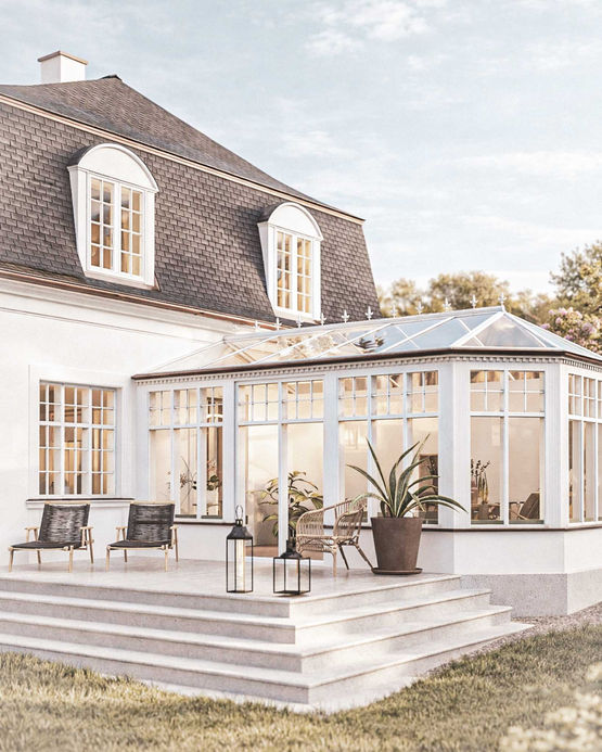 Kvalitetsmaterialer som klinkegulve, sildebensparket og teglgulv i orangeriet understøtter den tidløse æstetik og funktionalitet.
