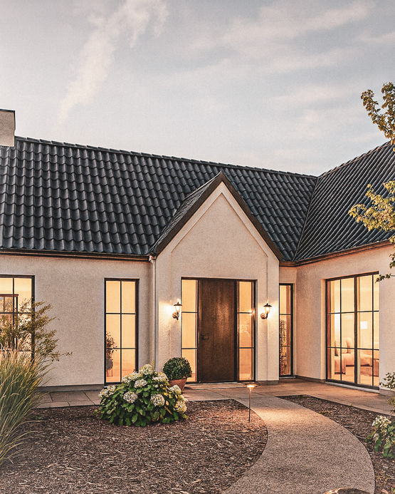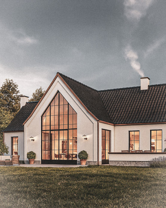 Den eksisterende tilbygning erstattes med en ny, der integreres naturligt i husets klassiske formsprog. Med en stejlere taghældning, spidse vinduer med sprosser, og sorte rammer opdateres villaen med et moderne touch uden at miste sin autentiske charme.