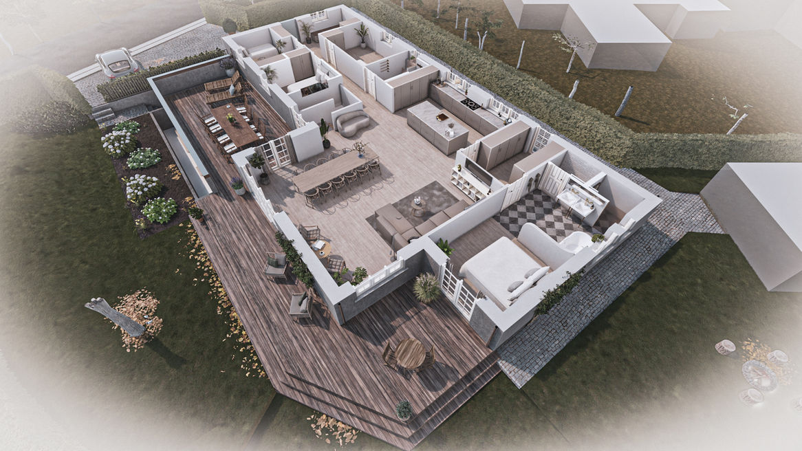 Vi har givet huset et gennemgående arkitektonisk løft: Facaden er blevet strammet op med sprossede vinduer, gesimser og pudsede flader i lyse nuancer. Udtrykket fremstår nu mere balanceret, roligt og gennemført – uden at gå på kompromis med husets nyere struktur.